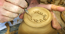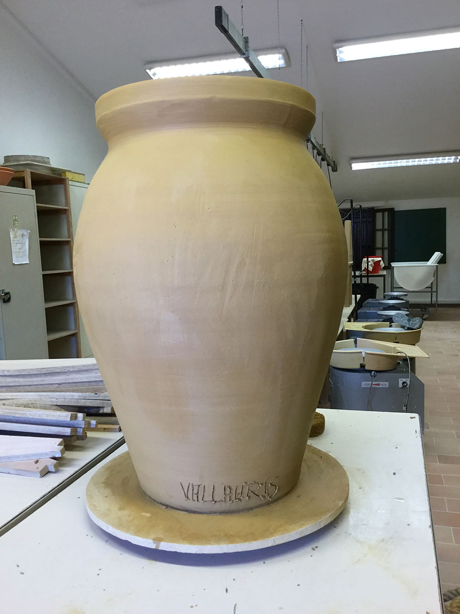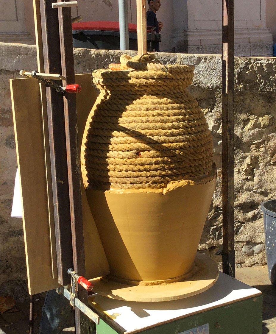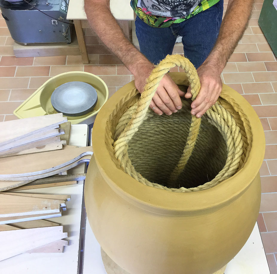 Cette technique, dite jarre à la corde, permet de réaliser de grandes jarres à l’aide d’un gabarit en bois autour duquel on enroule une corde de chanvre. Le gabarit est ensuite recouvert d’une couche régulière d’argile, puis la surface de la jarre est lissée. Après raffermissement de la terre on retire le gabarit en bois par le haut de la jarre ainsi que la corde. Suivront l’émaillage et une double cuisson à 980° et 1000/1040°. Vous pourrez découvrir cette technique à l’occasion de la Fête de la Poterie.