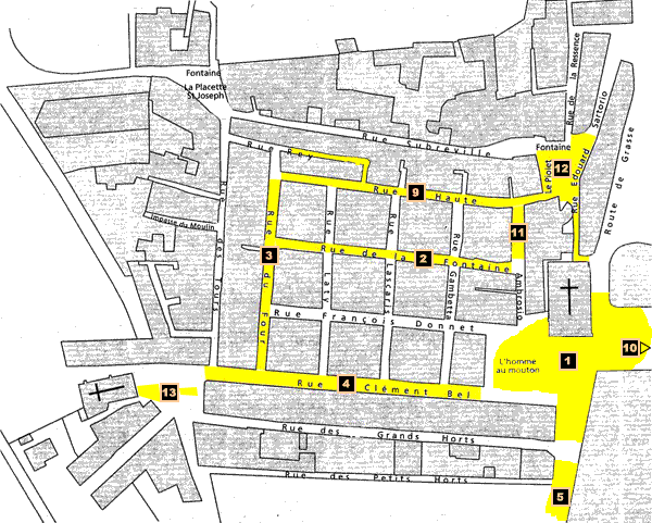 L’une des caractéristiques du village de Vallauris réside dans le fait que deux rues (la plus au nord, la rue Soubrane – la rue Haute aujourd’hui et au sud la rue Soutrane – la rue Clément Bel) reliaient par une droite parfaite les deux portes d’accès au village.
