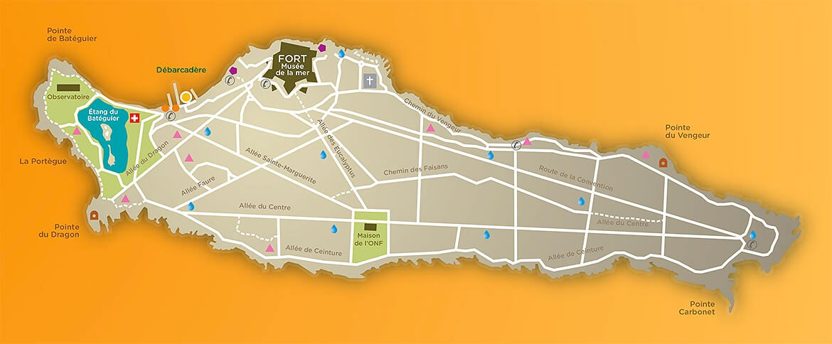 Sainte-Marguerite is the largest of the Lérins Islands, measuring 3.2km long and 900m across. A relaxing spot where visitors can soak up the joys of the beach and little coves lapped by turquoise waters. Here in this protected natural site that enjoys biological reserve status, stroll along the 20km of forest trails and paths dotted with maritime pines and eucalyptus trees. The perimeter of the island measures 8 kilometres.